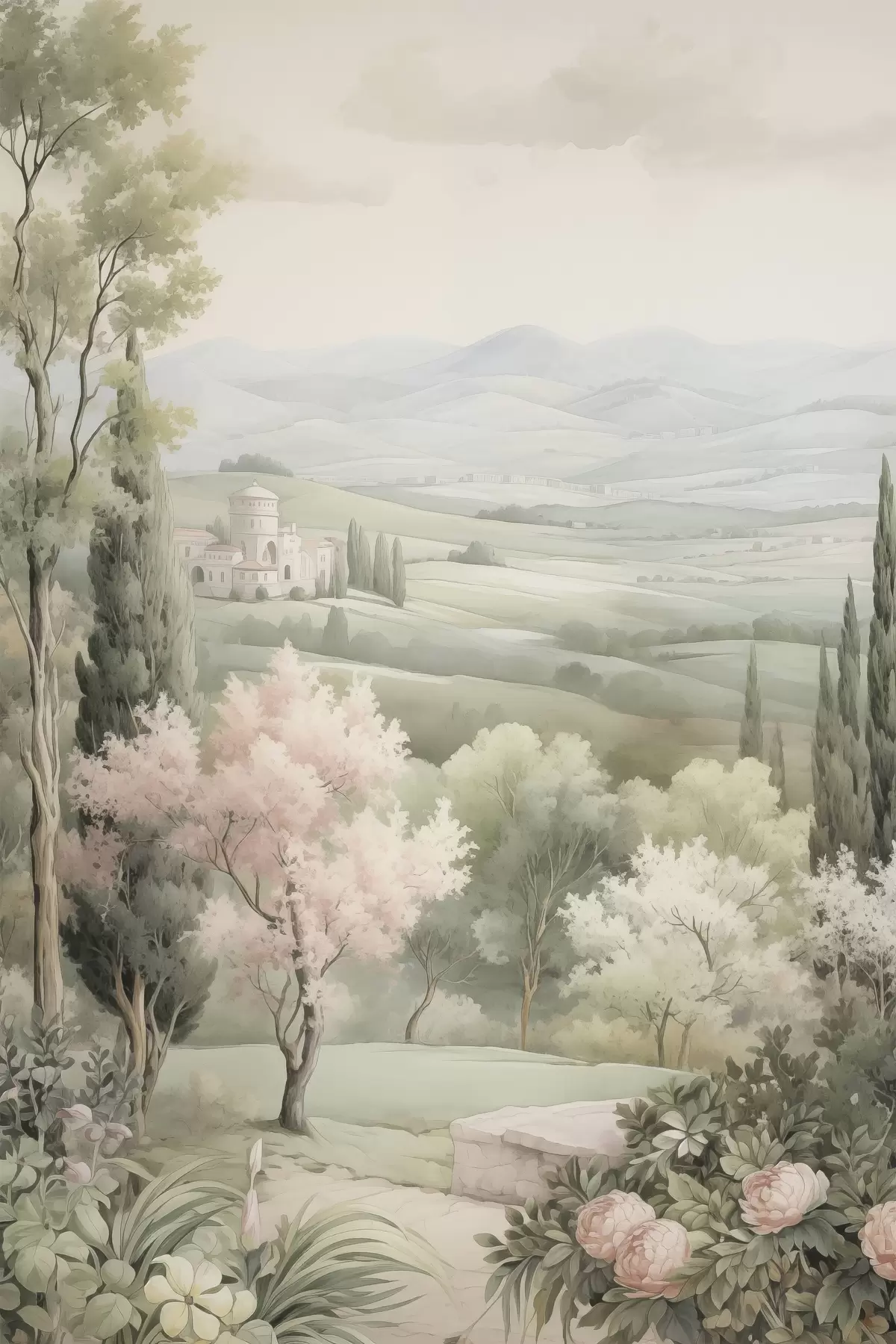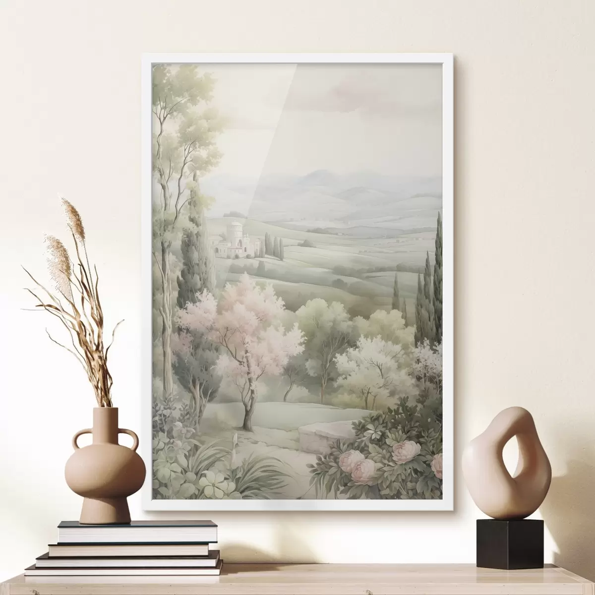 Poster Aquarel natuur, zachte kleuren, rozen, bomen, groene heuvels Nr f41223