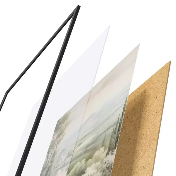 De poster bestaat uit een frame, plexiglas, geprinte afbeelding en spaanplaat achterkant. De poster kan meteen aan de muur worden gehangen dankzij de bevestigingen op de achterkant.