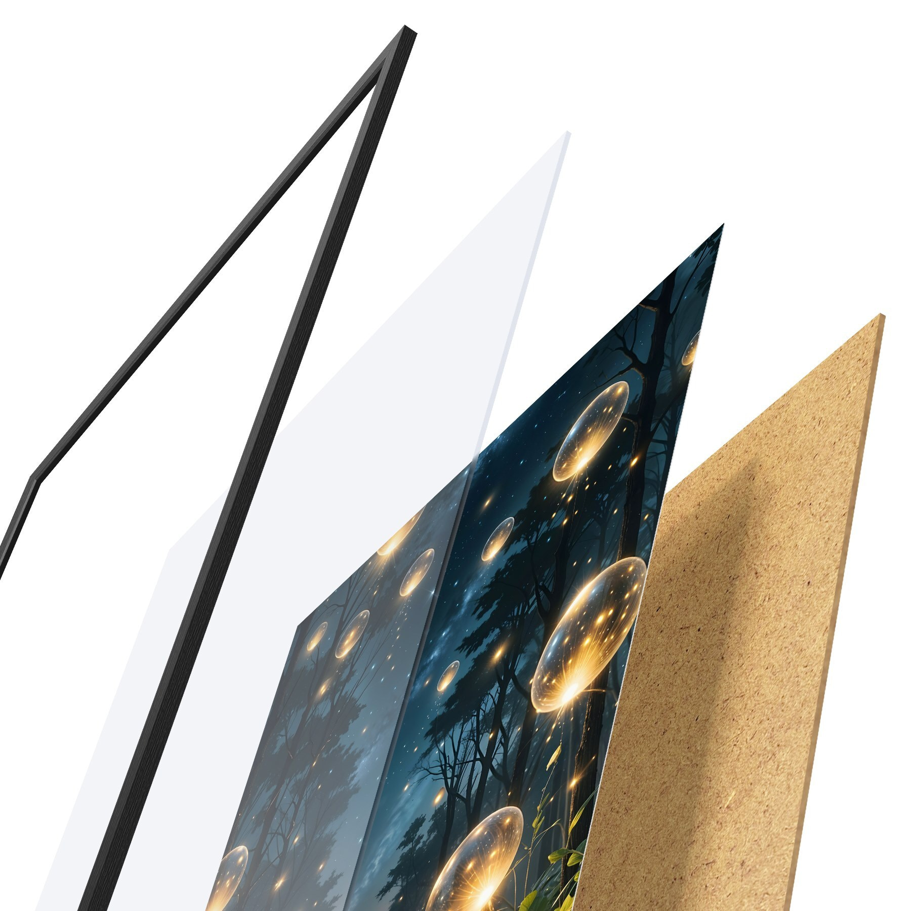 Poster Een magisch bos bij nacht met gele lichtbollen en vuurvliegjes die tussen de bomen zweven en een grillige sfeer creëren Nr f41259