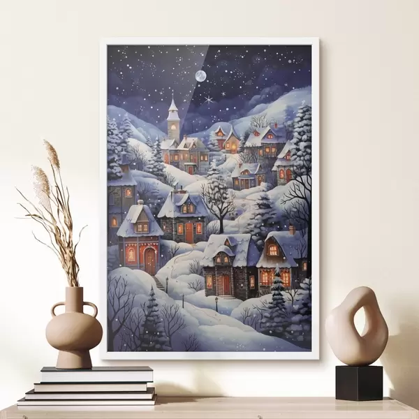 Poster Winterlandschap met besneeuwde landelijke huizen tegen de achtergrond van de nachtelijke sterrenhemel Nr f41275