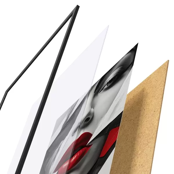 De poster bestaat uit een frame, plexiglas, geprinte afbeelding en spaanplaat achterkant. De poster kan meteen aan de muur worden gehangen dankzij de bevestigingen op de achterkant.