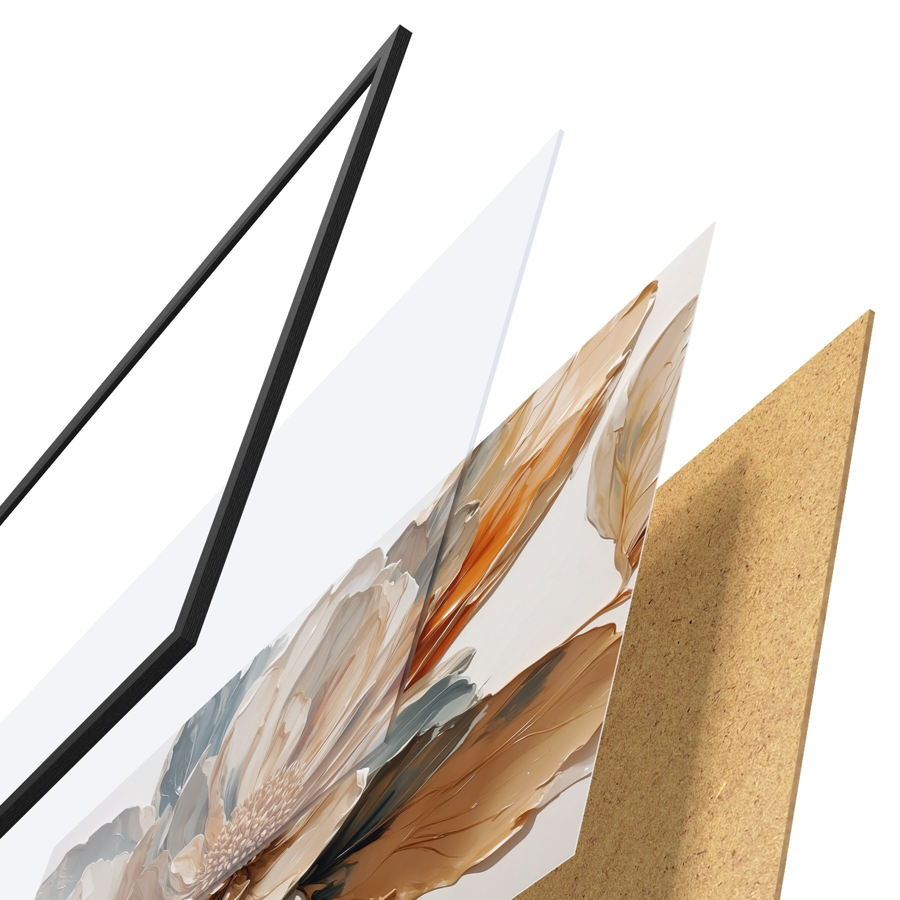 De poster bestaat uit een frame, plexiglas, geprinte afbeelding en spaanplaat achterkant. De poster kan meteen aan de muur worden gehangen dankzij de bevestigingen op de achterkant.