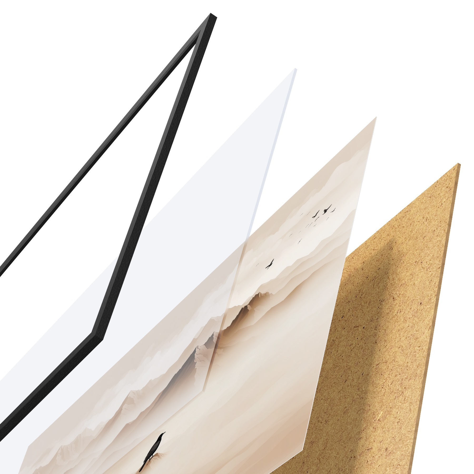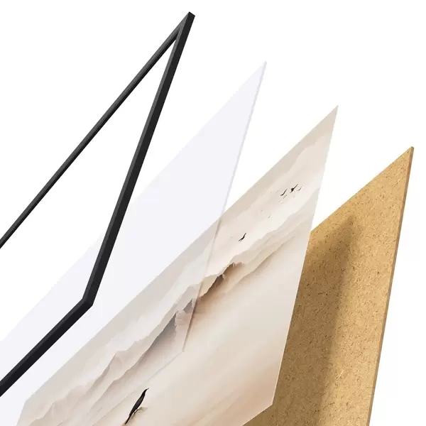 De poster bestaat uit een frame, plexiglas, geprinte afbeelding en spaanplaat achterkant. De poster kan meteen aan de muur worden gehangen dankzij de bevestigingen op de achterkant.