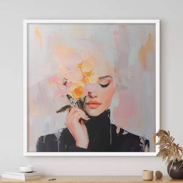 Poster Abstracte vrouw met een boeket bloemen in haar handen met penseelstreken Nr f41355