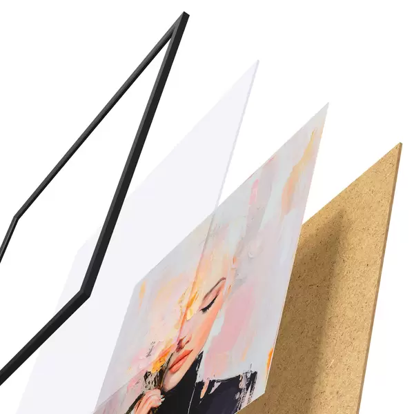 De poster bestaat uit een frame, plexiglas, geprinte afbeelding en spaanplaat achterkant. De poster kan meteen aan de muur worden gehangen dankzij de bevestigingen op de achterkant.