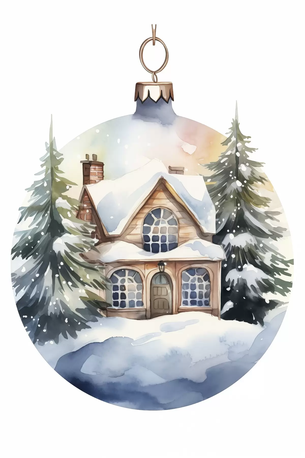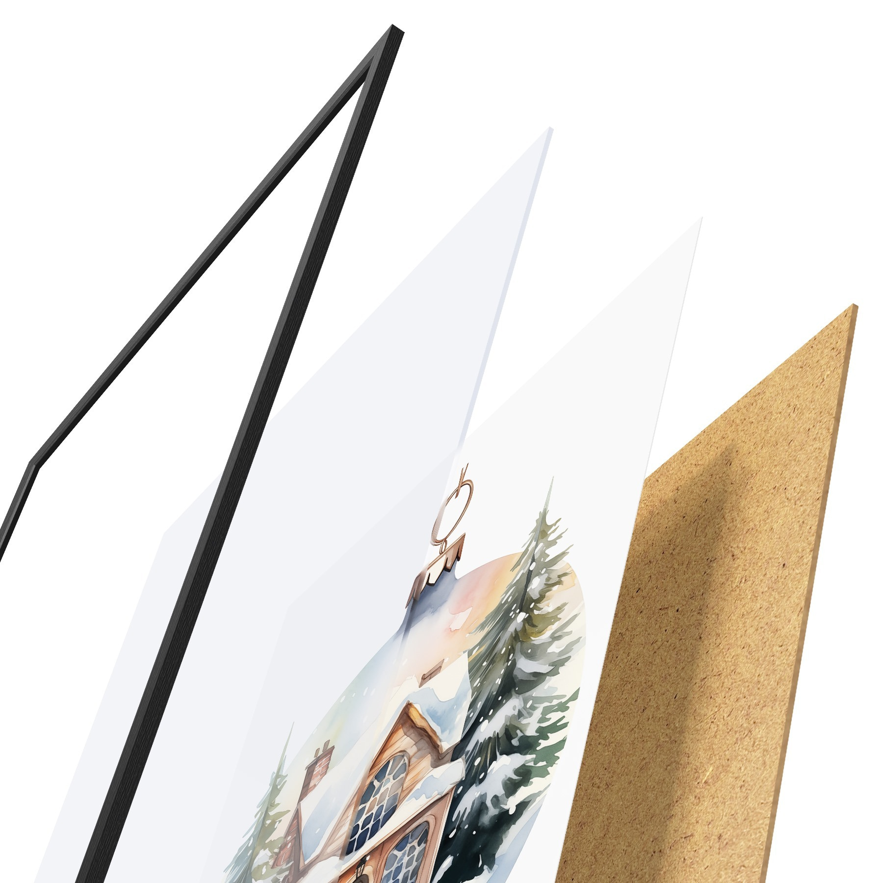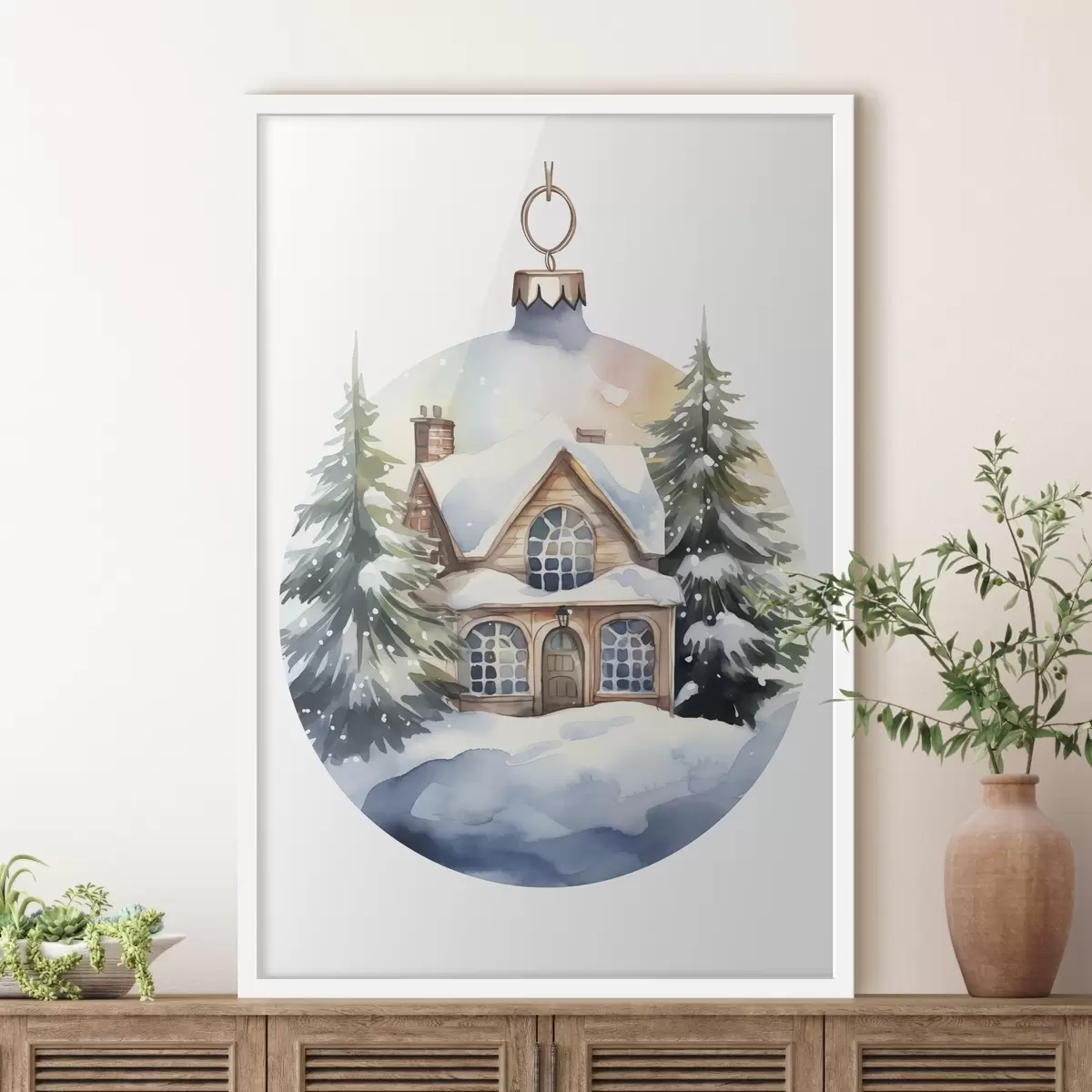 Poster Decoratieve kerstbal met aquarel huis in de sneeuw, dennenbomen Nr f41363
