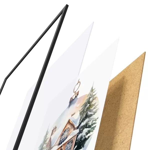 De poster bestaat uit een frame, plexiglas, geprinte afbeelding en spaanplaat achterkant. De poster kan meteen aan de muur worden gehangen dankzij de bevestigingen op de achterkant.