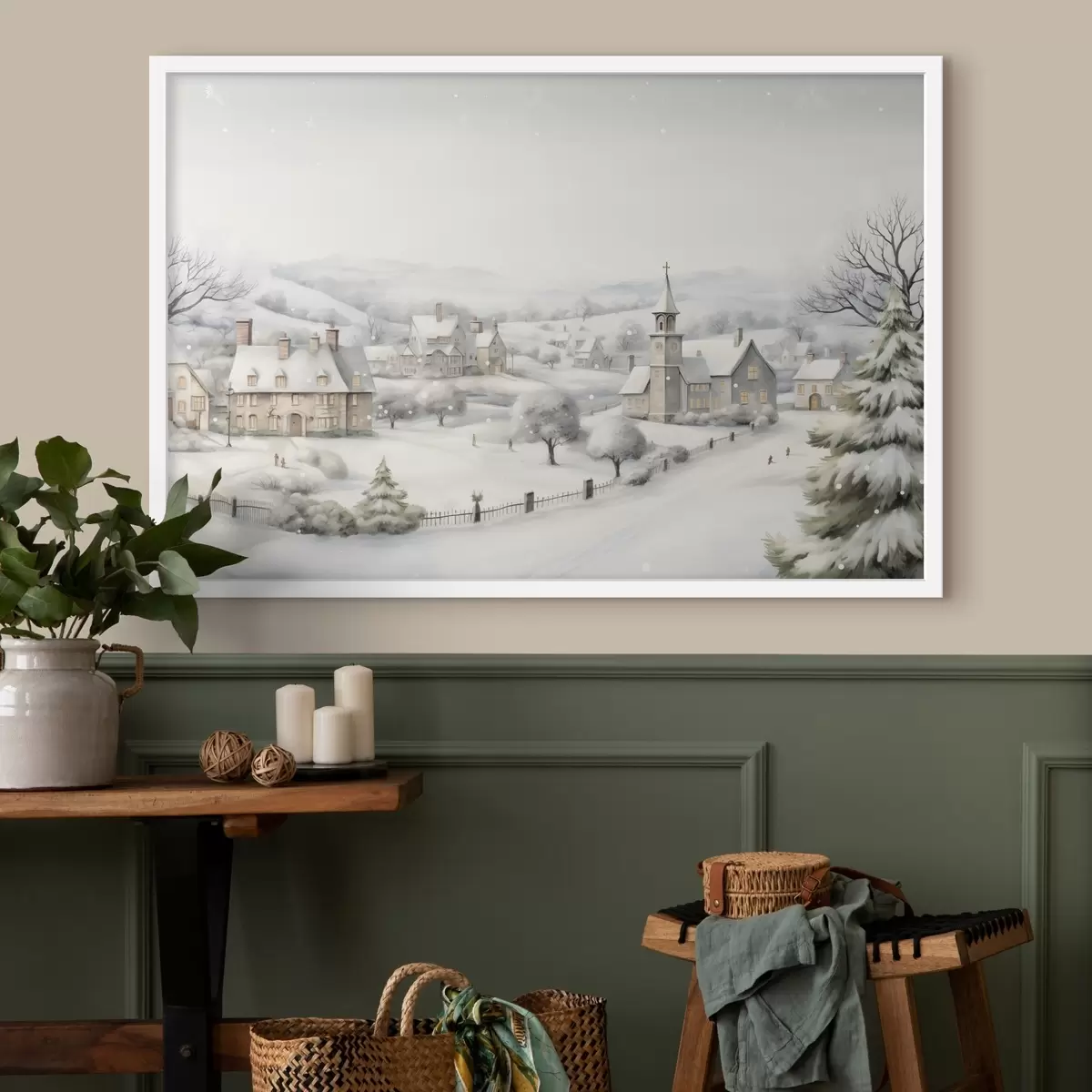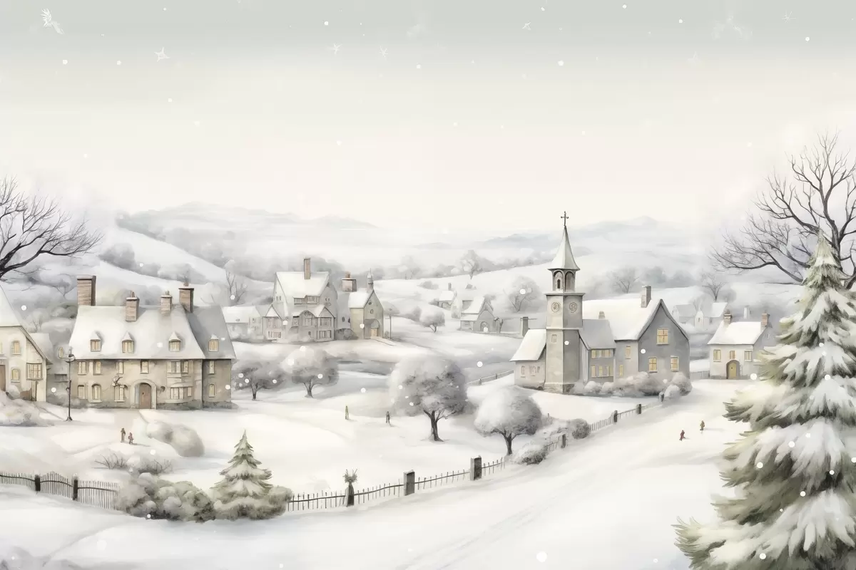 Poster Mooi winterdorp, bomen, huizen, aquarel, bergen Nr f41382