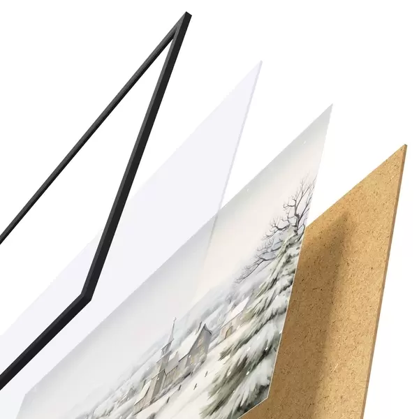 De poster bestaat uit een frame, plexiglas, geprinte afbeelding en spaanplaat achterkant. De poster kan meteen aan de muur worden gehangen dankzij de bevestigingen op de achterkant.