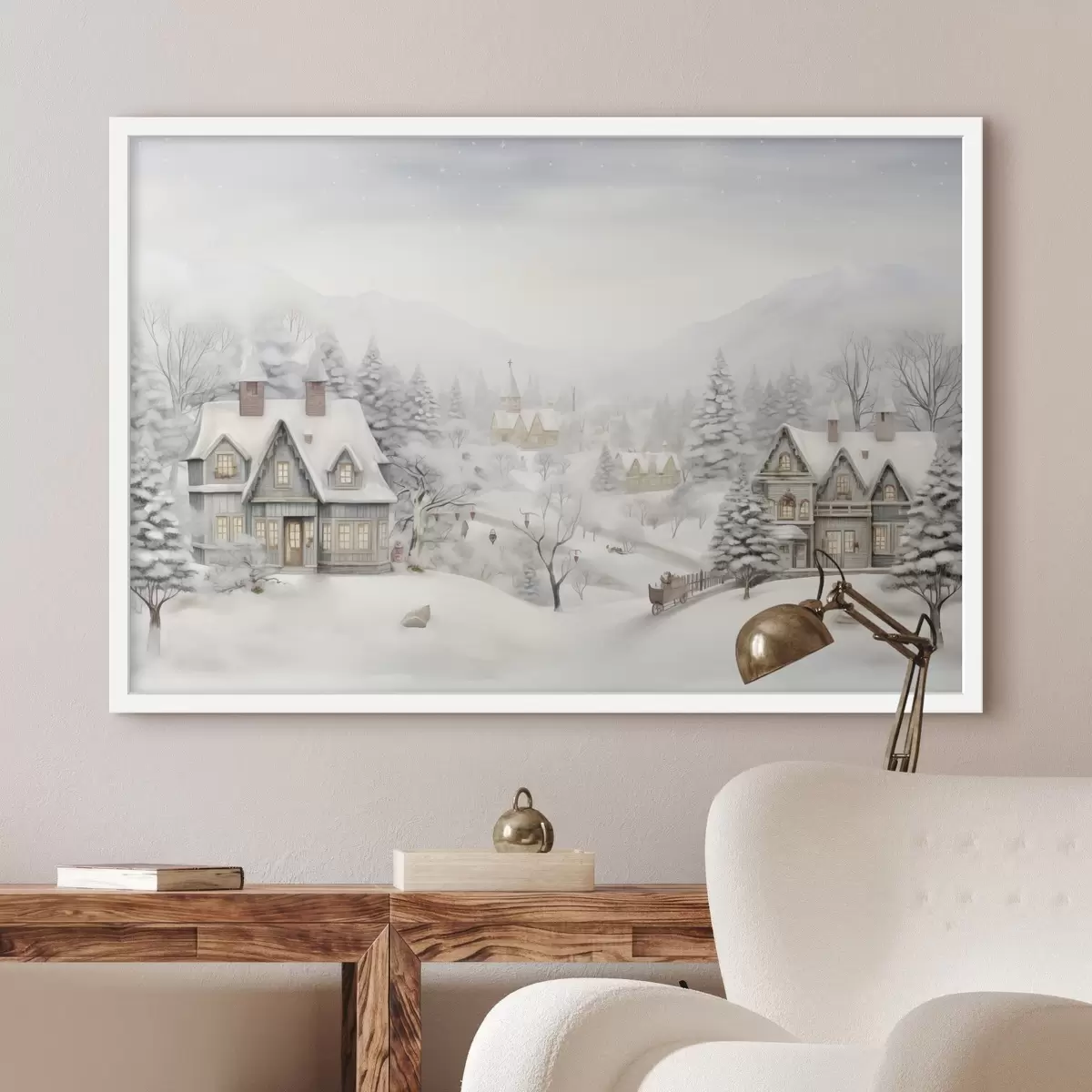 Poster Prachtig winterlandschap met dorp, pijnbomen, huizen, bergen Nr f41384