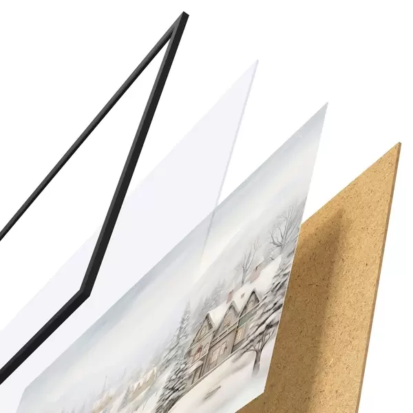 De poster bestaat uit een frame, plexiglas, geprinte afbeelding en spaanplaat achterkant. De poster kan meteen aan de muur worden gehangen dankzij de bevestigingen op de achterkant.