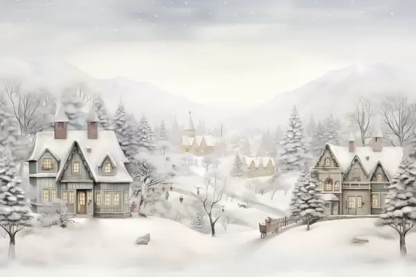 Poster Prachtig winterlandschap met dorp, pijnbomen, huizen, bergen Nr f41384