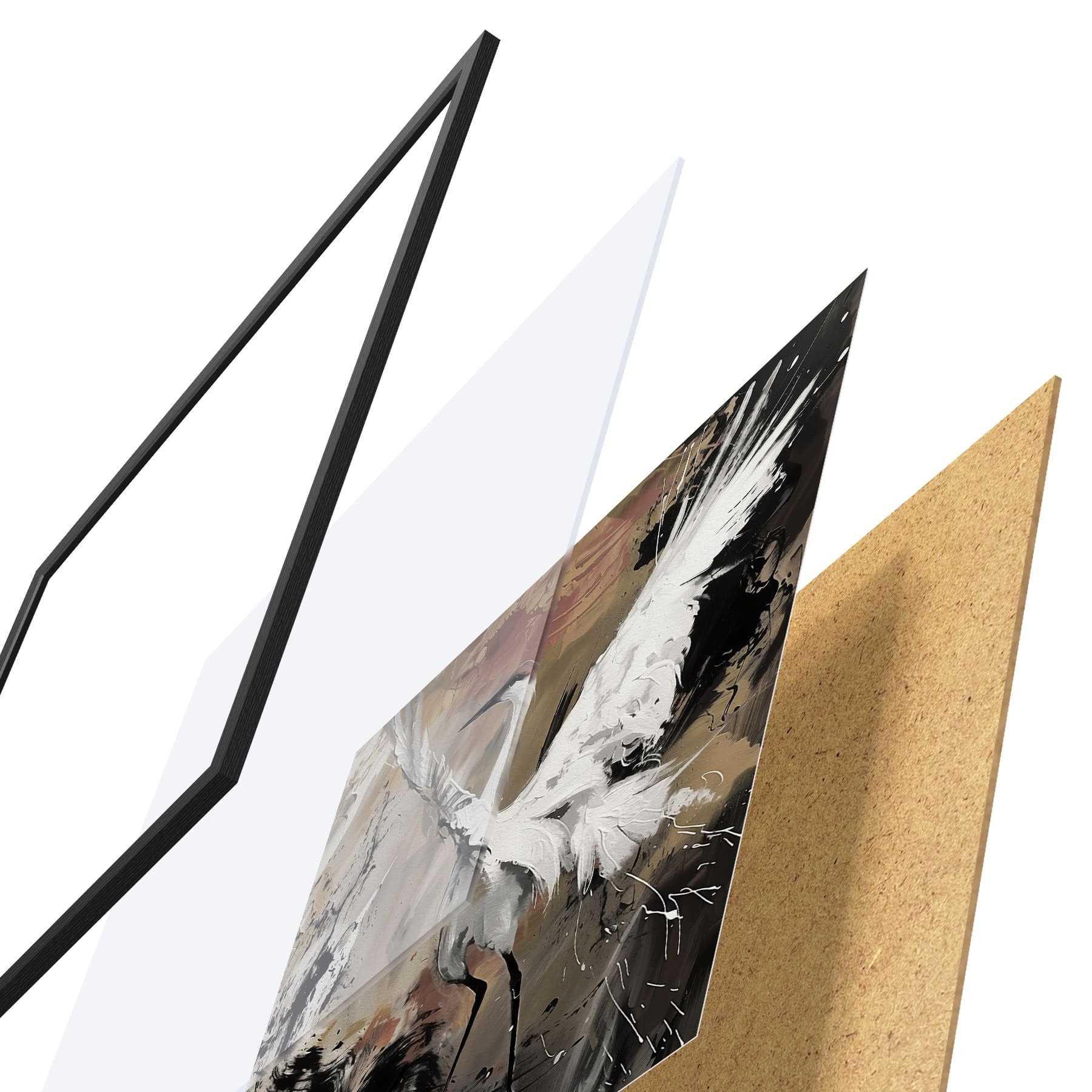 De poster bestaat uit een frame, plexiglas, geprinte afbeelding en spaanplaat achterkant. De poster kan meteen aan de muur worden gehangen dankzij de bevestigingen op de achterkant.