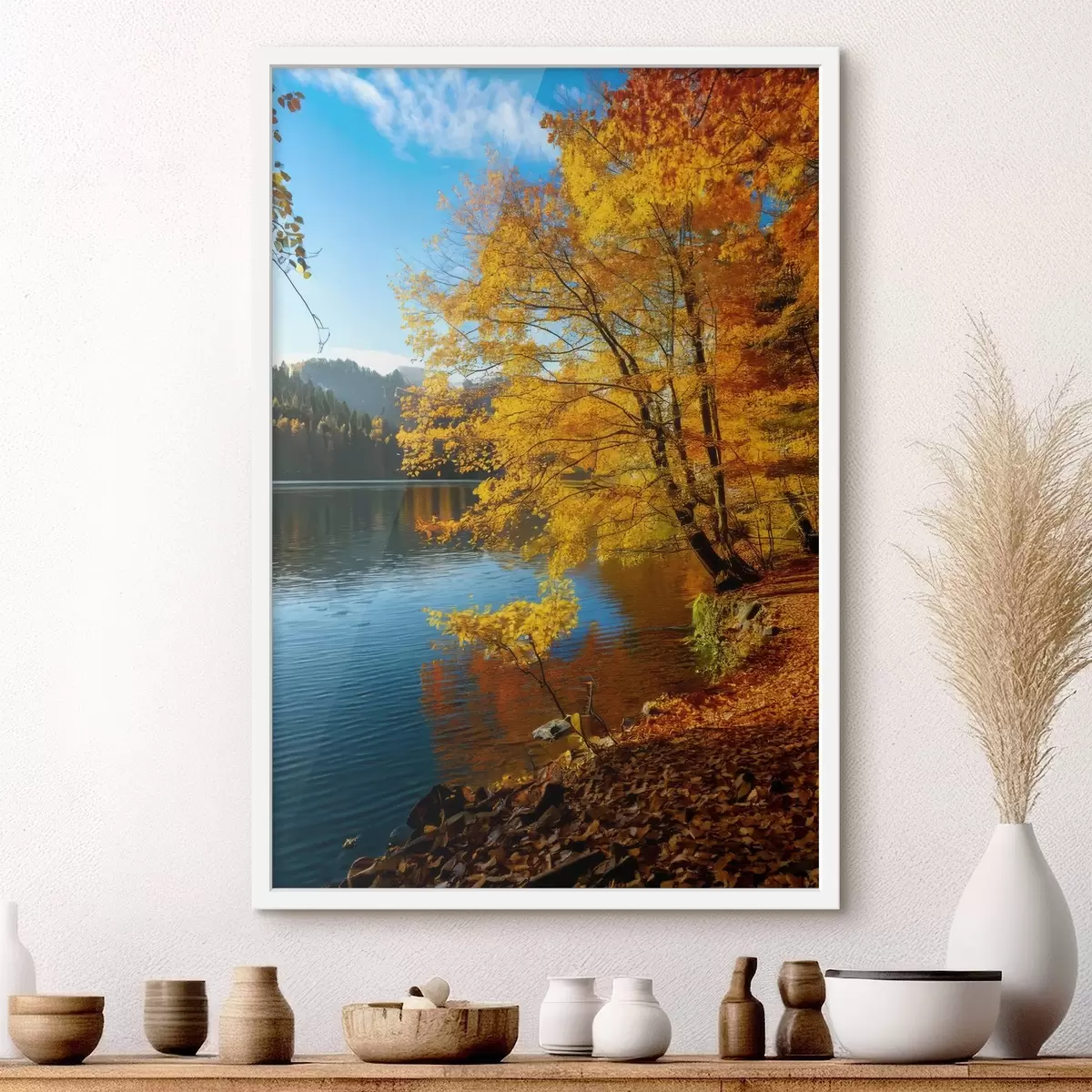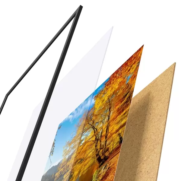 De poster bestaat uit een frame, plexiglas, geprinte afbeelding en spaanplaat achterkant. De poster kan meteen aan de muur worden gehangen dankzij de bevestigingen op de achterkant.