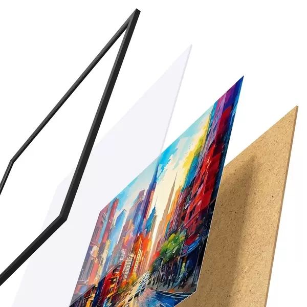 De poster bestaat uit een frame, plexiglas, geprinte afbeelding en spaanplaat achterkant. De poster kan meteen aan de muur worden gehangen dankzij de bevestigingen op de achterkant.