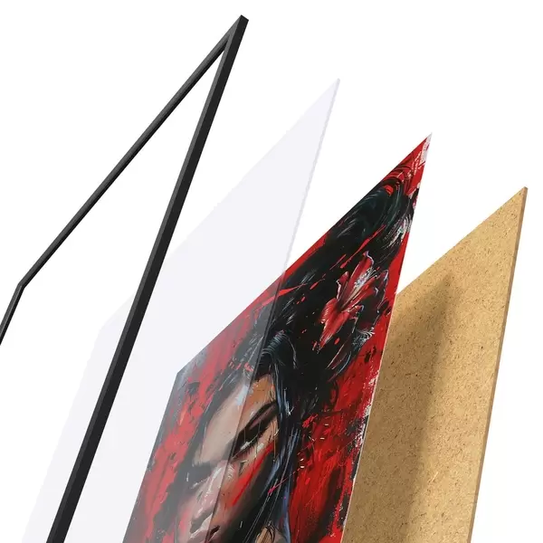 De poster bestaat uit een frame, plexiglas, geprinte afbeelding en spaanplaat achterkant. De poster kan meteen aan de muur worden gehangen dankzij de bevestigingen op de achterkant.