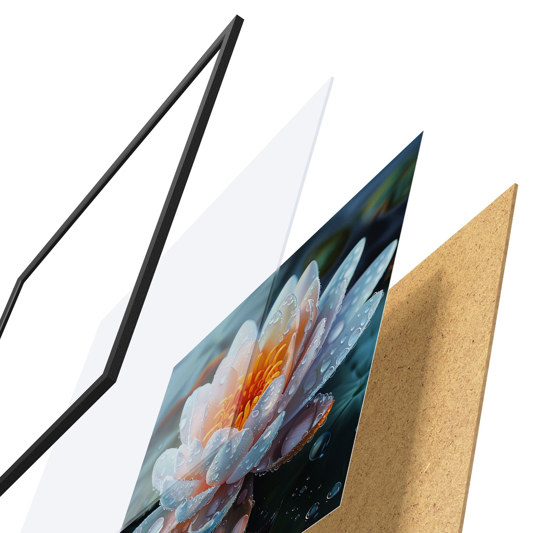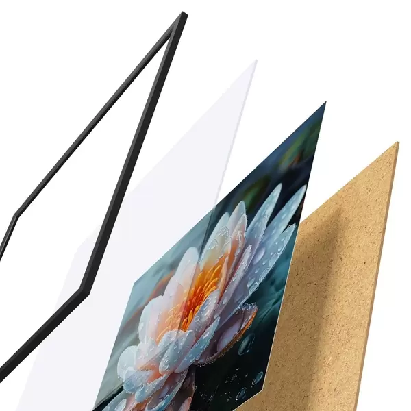 De poster bestaat uit een frame, plexiglas, geprinte afbeelding en spaanplaat achterkant. De poster kan meteen aan de muur worden gehangen dankzij de bevestigingen op de achterkant.