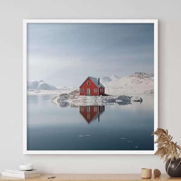 Poster Minimalistisch winterlandschap rood huis aan het meer Nr f41437