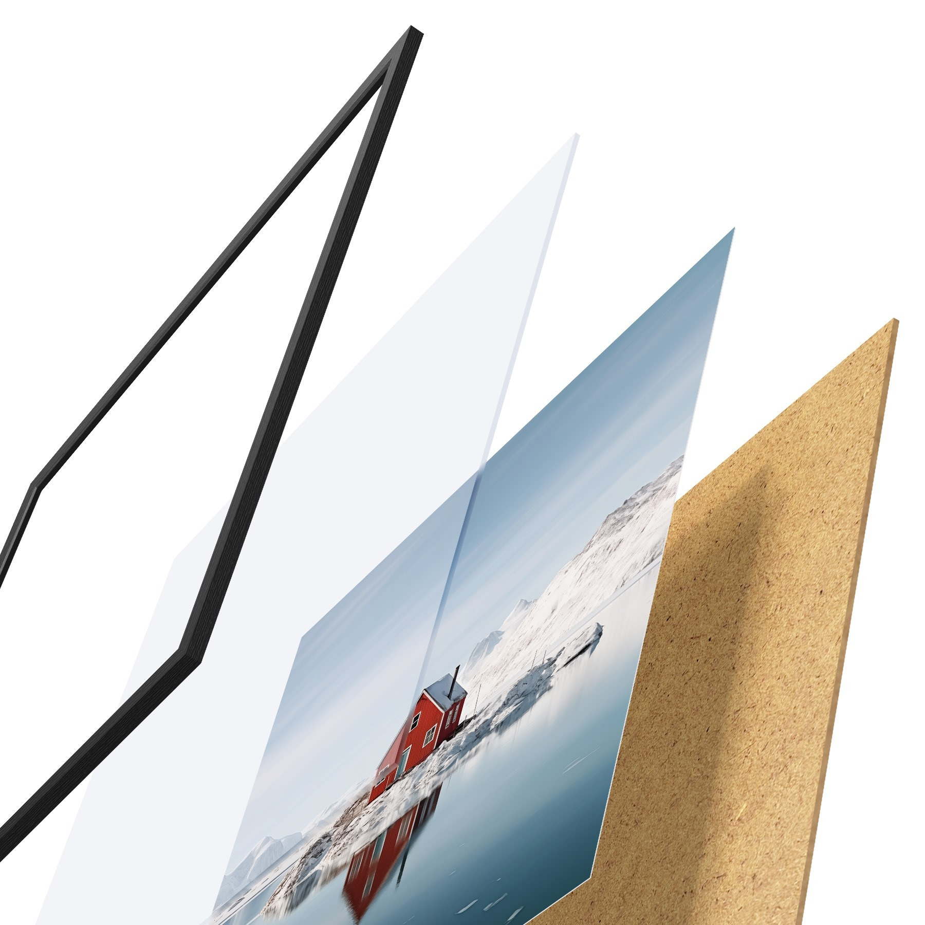 De poster bestaat uit een frame, plexiglas, geprinte afbeelding en spaanplaat achterkant. De poster kan meteen aan de muur worden gehangen dankzij de bevestigingen op de achterkant.