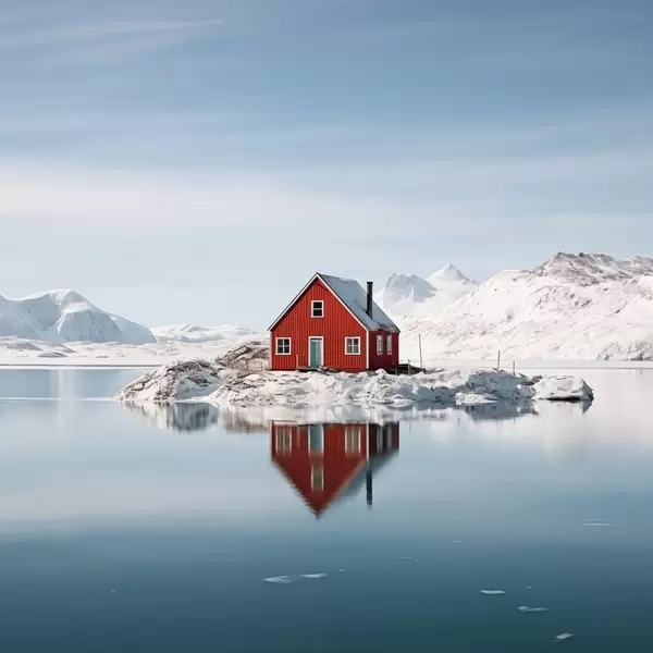 Poster Minimalistisch winterlandschap rood huis aan het meer Nr f41437