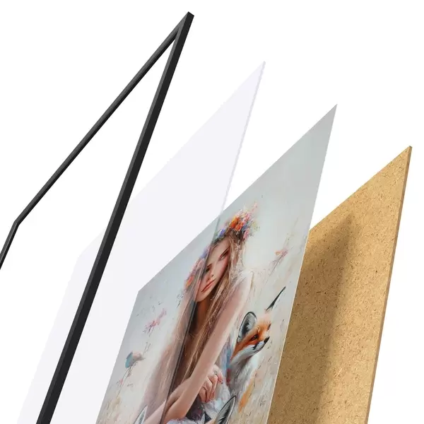 De poster bestaat uit een frame, plexiglas, geprinte afbeelding en spaanplaat achterkant. De poster kan meteen aan de muur worden gehangen dankzij de bevestigingen op de achterkant.