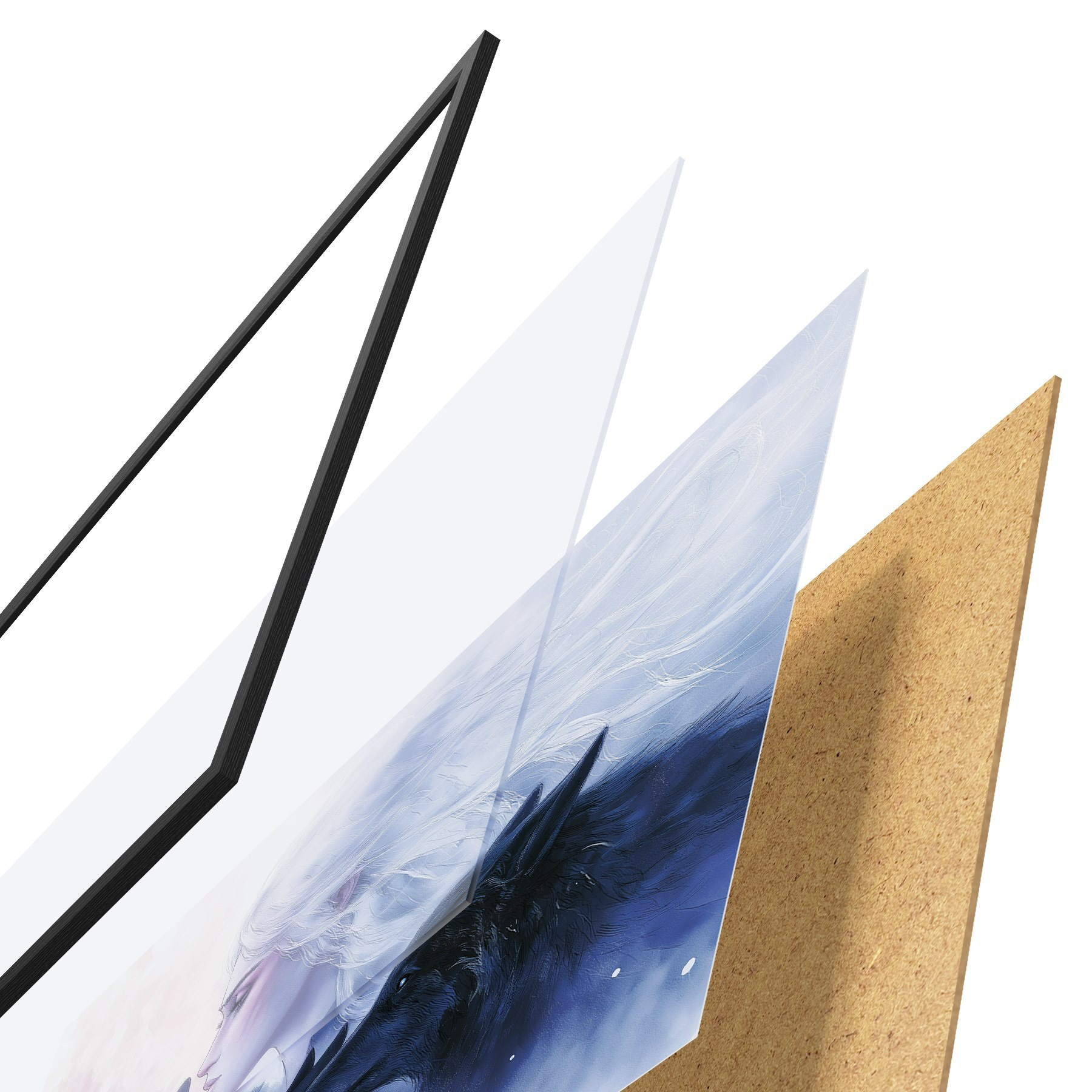 De poster bestaat uit een frame, plexiglas, geprinte afbeelding en spaanplaat achterkant. De poster kan meteen aan de muur worden gehangen dankzij de bevestigingen op de achterkant.