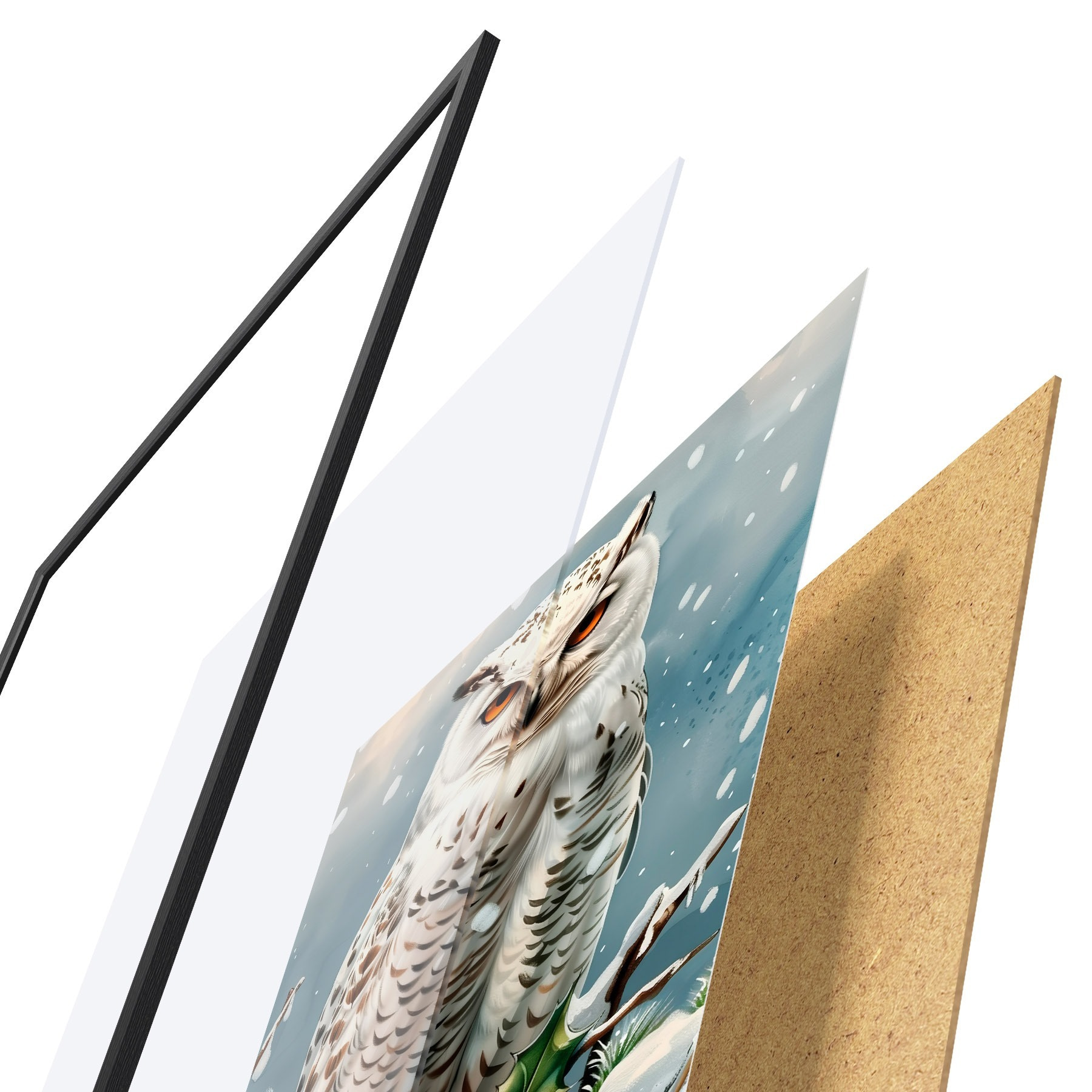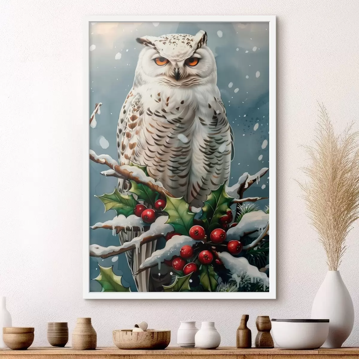 Poster Uil op een wintertak met bessen en bladeren f41482