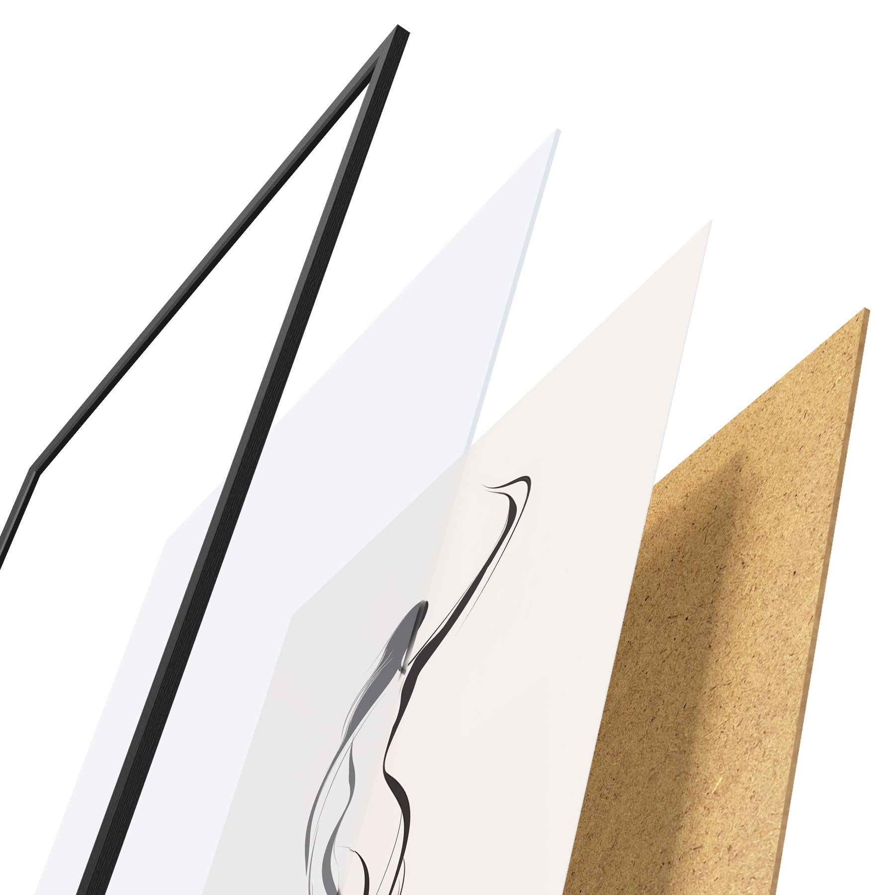 De poster bestaat uit een frame, plexiglas, geprinte afbeelding en spaanplaat achterkant. De poster kan meteen aan de muur worden gehangen dankzij de bevestigingen op de achterkant.