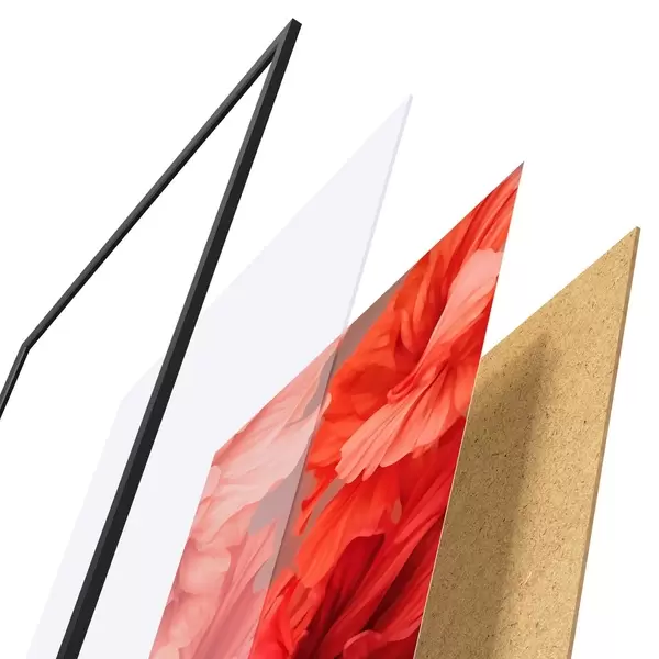 De poster bestaat uit een frame, plexiglas, geprinte afbeelding en spaanplaat achterkant. De poster kan meteen aan de muur worden gehangen dankzij de bevestigingen op de achterkant.