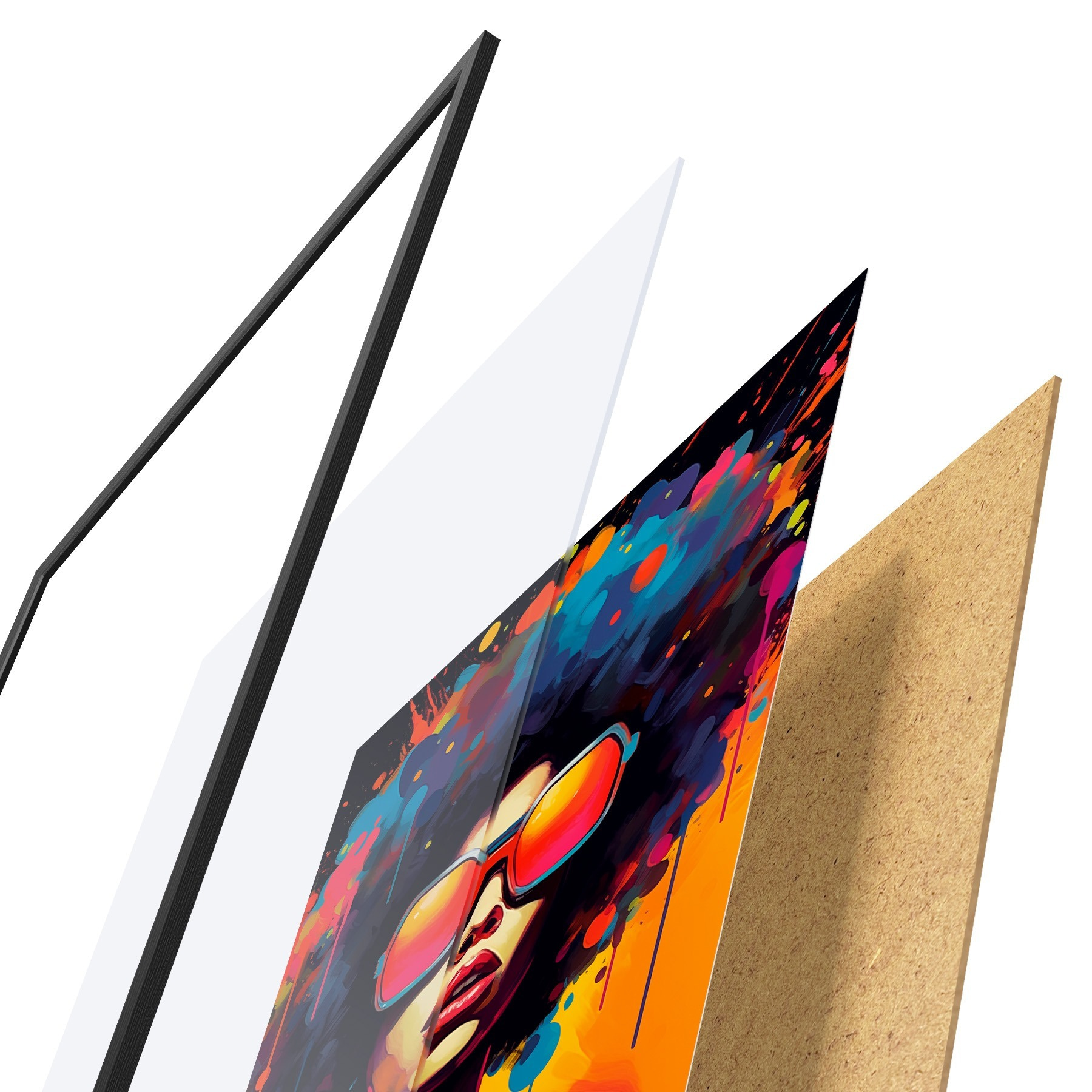 De poster bestaat uit een frame, plexiglas, geprinte afbeelding en spaanplaat achterkant. De poster kan meteen aan de muur worden gehangen dankzij de bevestigingen op de achterkant.