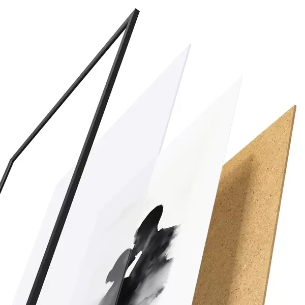 De poster bestaat uit een frame, plexiglas, geprinte afbeelding en spaanplaat achterkant. De poster kan meteen aan de muur worden gehangen dankzij de bevestigingen op de achterkant.
