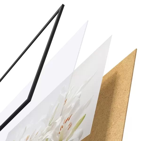De poster bestaat uit een frame, plexiglas, geprinte afbeelding en spaanplaat achterkant. De poster kan meteen aan de muur worden gehangen dankzij de bevestigingen op de achterkant.