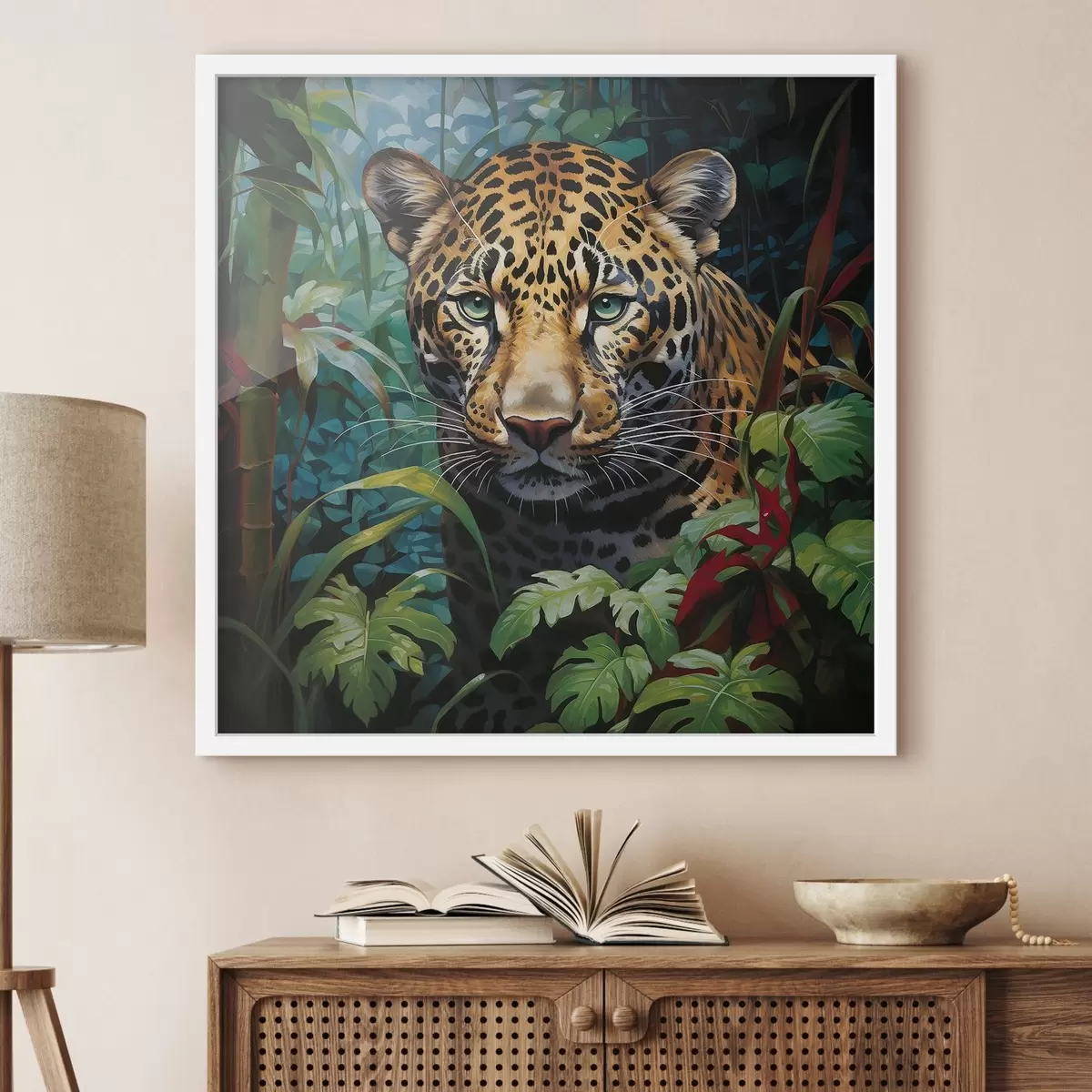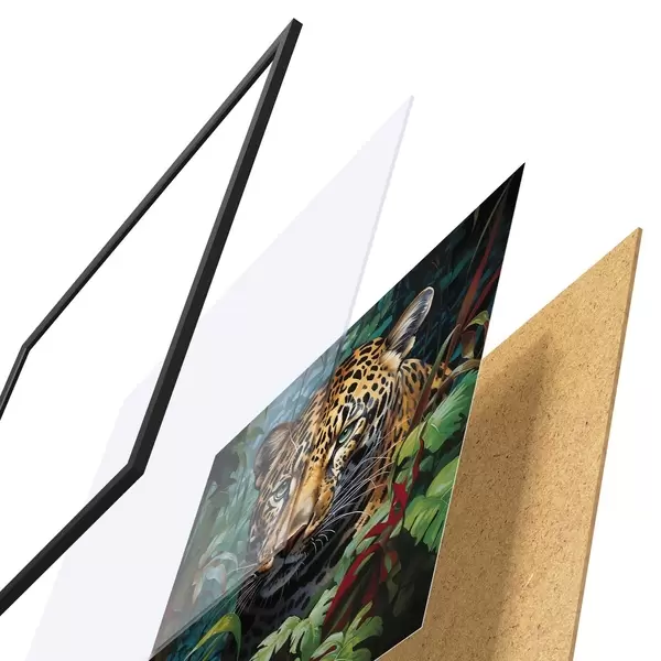 De poster bestaat uit een frame, plexiglas, geprinte afbeelding en spaanplaat achterkant. De poster kan meteen aan de muur worden gehangen dankzij de bevestigingen op de achterkant.