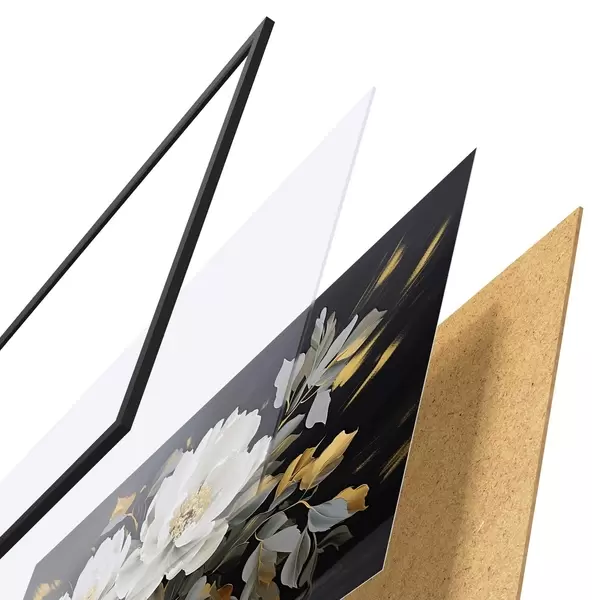 De poster bestaat uit een frame, plexiglas, geprinte afbeelding en spaanplaat achterkant. De poster kan meteen aan de muur worden gehangen dankzij de bevestigingen op de achterkant.