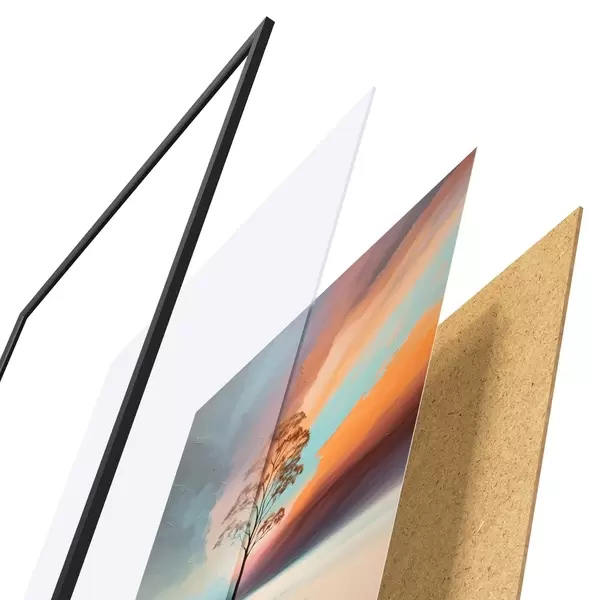 De poster bestaat uit een frame, plexiglas, geprinte afbeelding en spaanplaat achterkant. De poster kan meteen aan de muur worden gehangen dankzij de bevestigingen op de achterkant.
