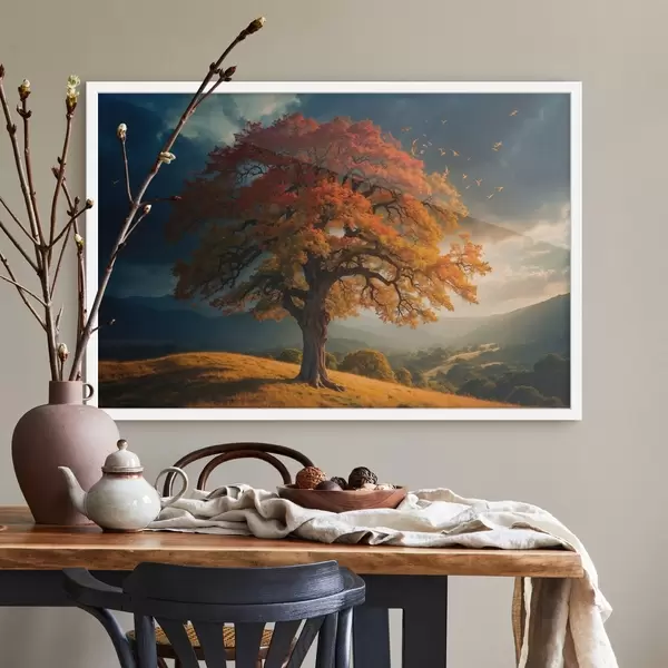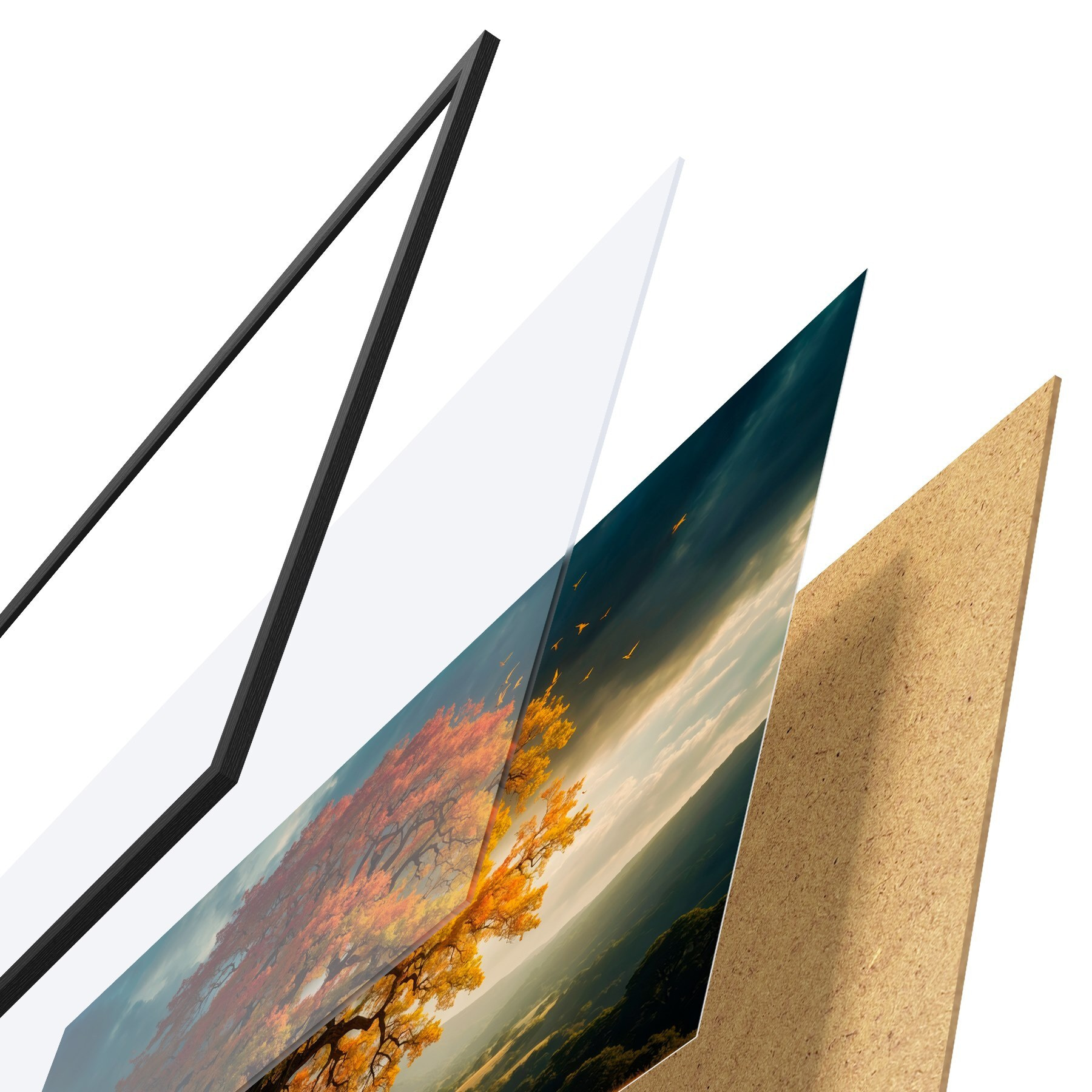 De poster bestaat uit een frame, plexiglas, geprinte afbeelding en spaanplaat achterkant. De poster kan meteen aan de muur worden gehangen dankzij de bevestigingen op de achterkant.
