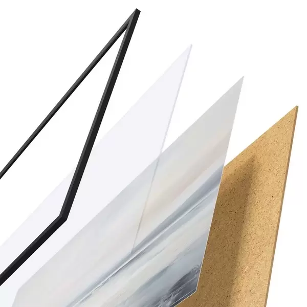 De poster bestaat uit een frame, plexiglas, geprinte afbeelding en spaanplaat achterkant. De poster kan meteen aan de muur worden gehangen dankzij de bevestigingen op de achterkant.