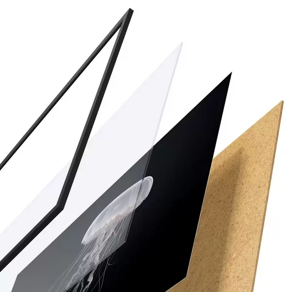 De poster bestaat uit een frame, plexiglas, geprinte afbeelding en spaanplaat achterkant. De poster kan meteen aan de muur worden gehangen dankzij de bevestigingen op de achterkant.
