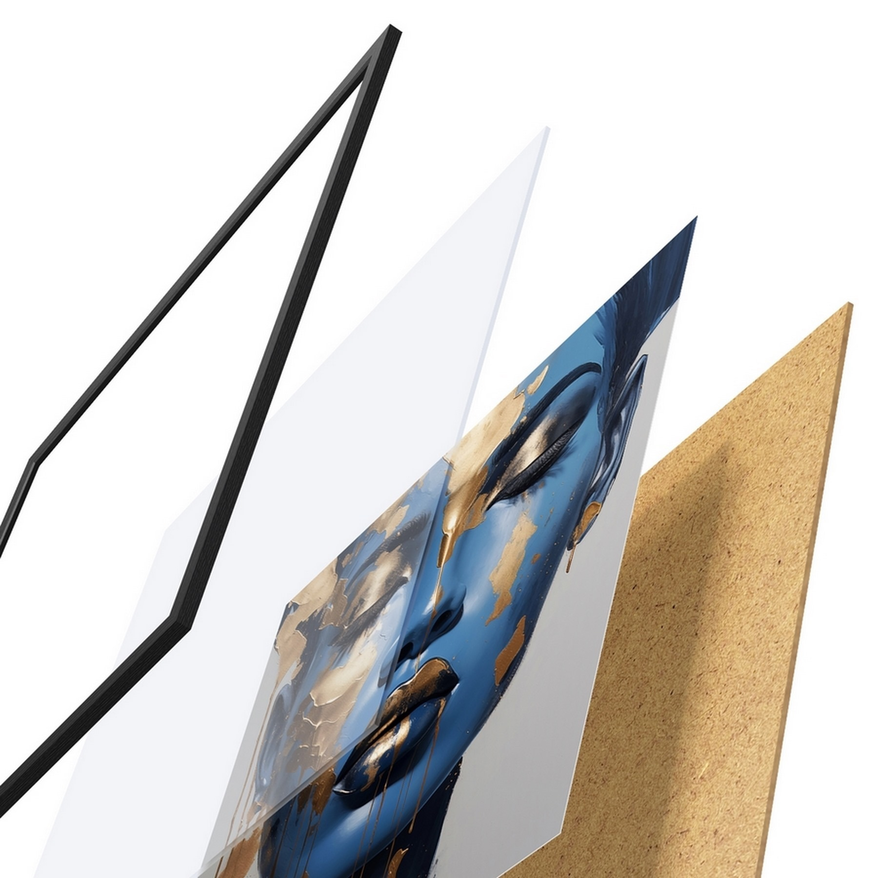De poster bestaat uit een frame, plexiglas, geprinte afbeelding en spaanplaat achterkant. De poster kan meteen aan de muur worden gehangen dankzij de bevestigingen op de achterkant.