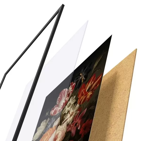 De poster bestaat uit een frame, plexiglas, geprinte afbeelding en spaanplaat achterkant. De poster kan meteen aan de muur worden gehangen dankzij de bevestigingen op de achterkant.