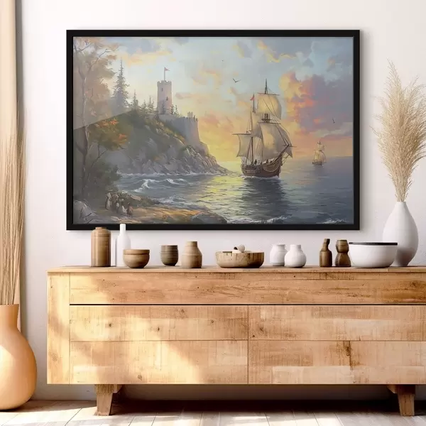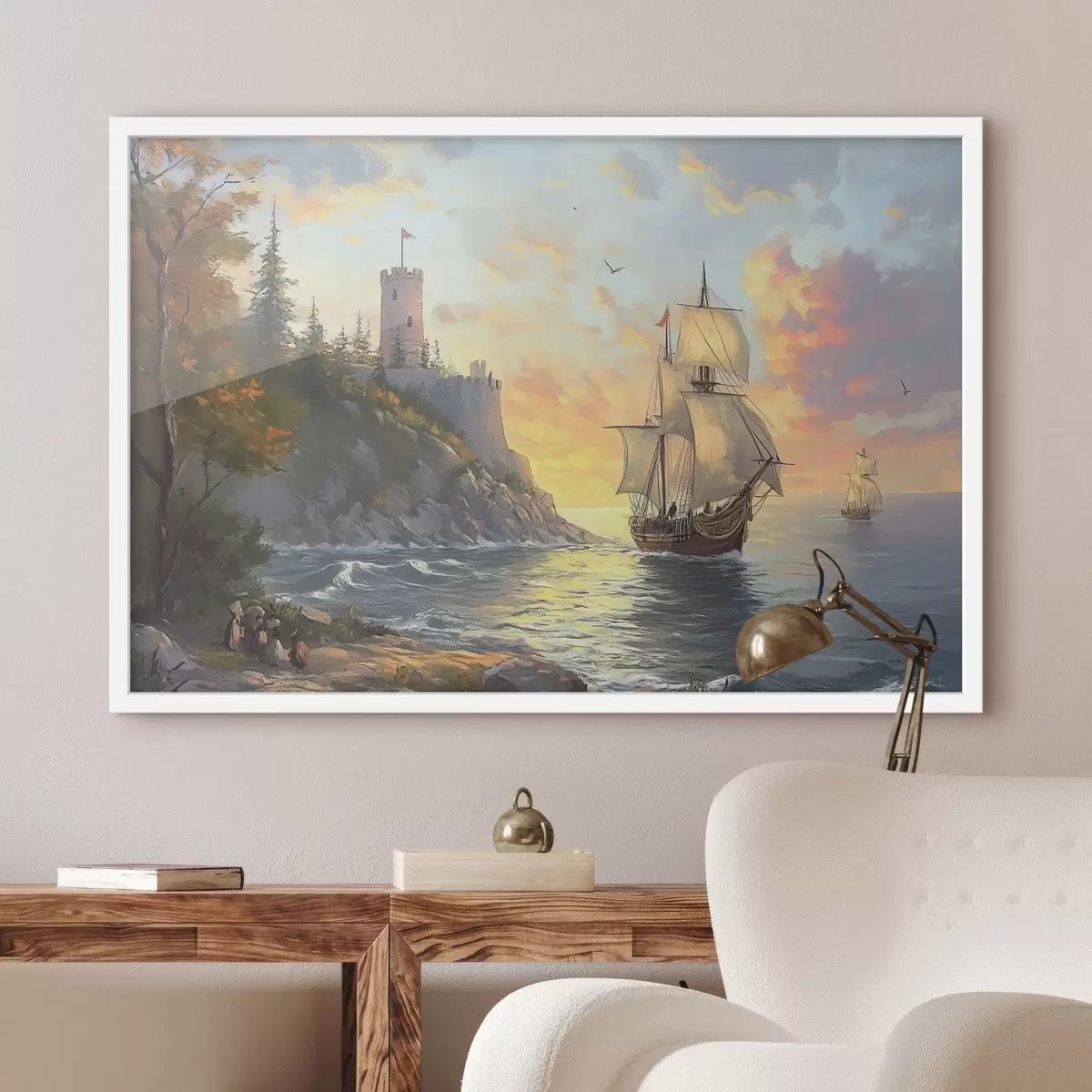 Poster schip bij de kust bij zonsopgang Nr f41626