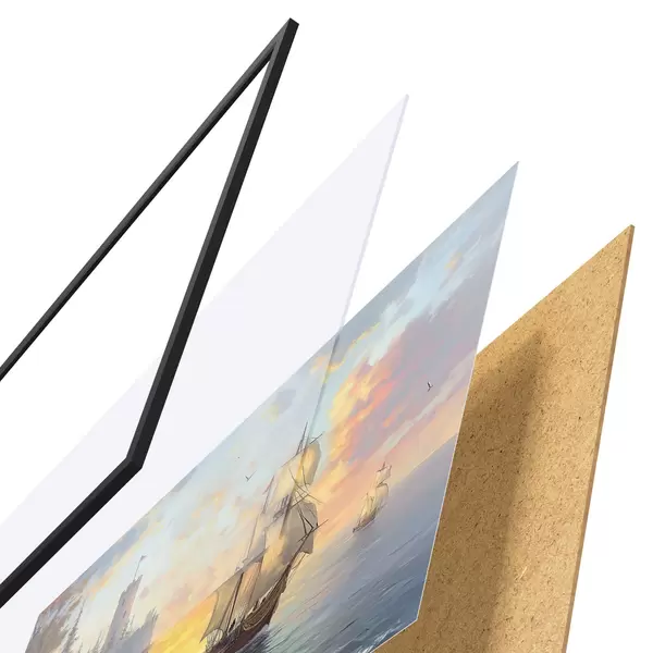 De poster bestaat uit een frame, plexiglas, geprinte afbeelding en spaanplaat achterkant. De poster kan meteen aan de muur worden gehangen dankzij de bevestigingen op de achterkant.