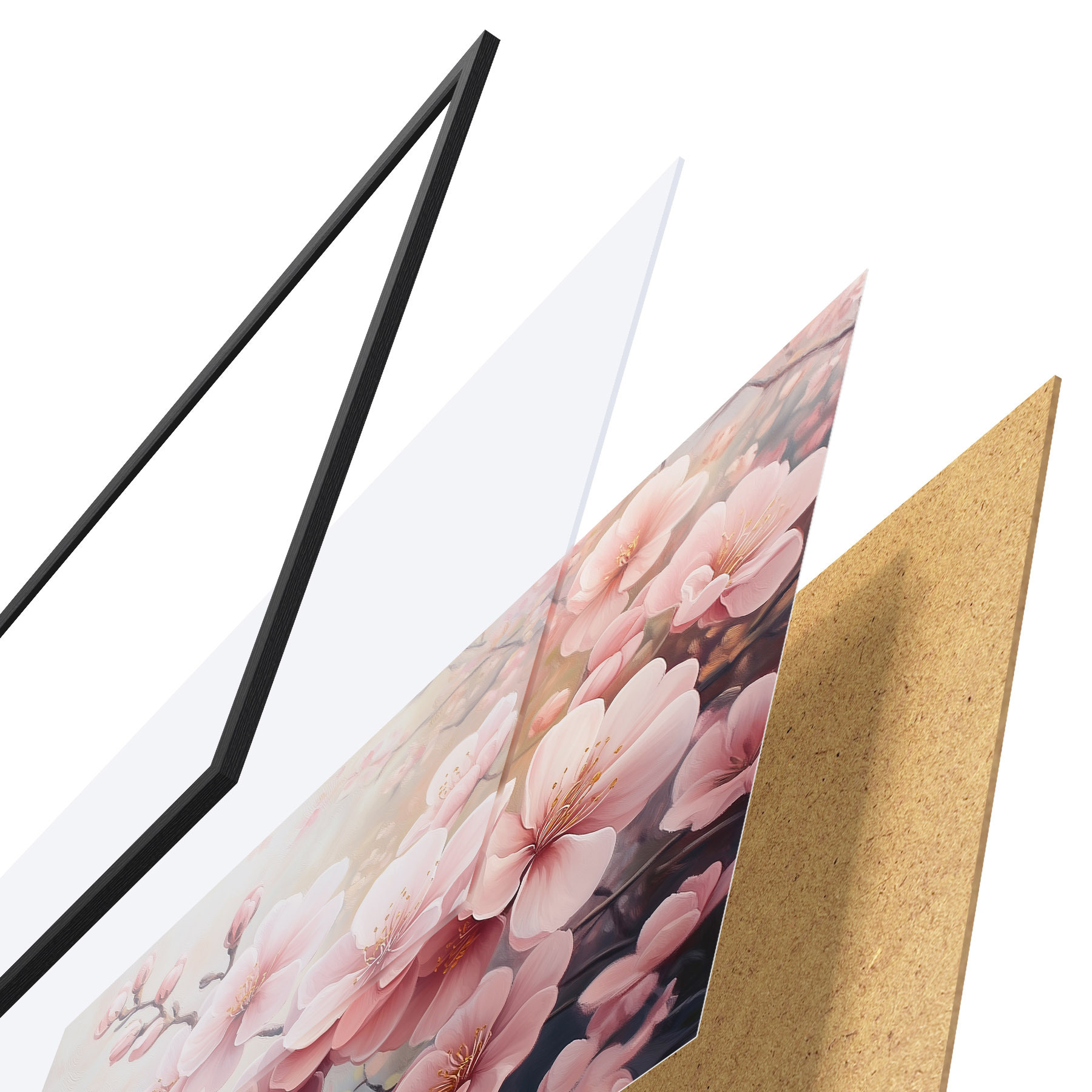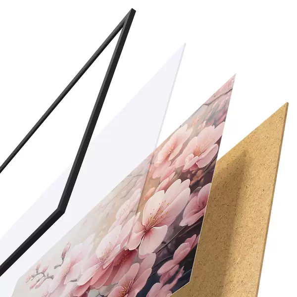 De poster bestaat uit een frame, plexiglas, geprinte afbeelding en spaanplaat achterkant. De poster kan meteen aan de muur worden gehangen dankzij de bevestigingen op de achterkant.