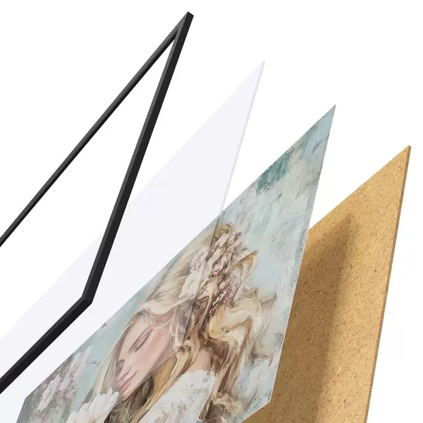 De poster bestaat uit een frame, plexiglas, geprinte afbeelding en spaanplaat achterkant. De poster kan meteen aan de muur worden gehangen dankzij de bevestigingen op de achterkant.