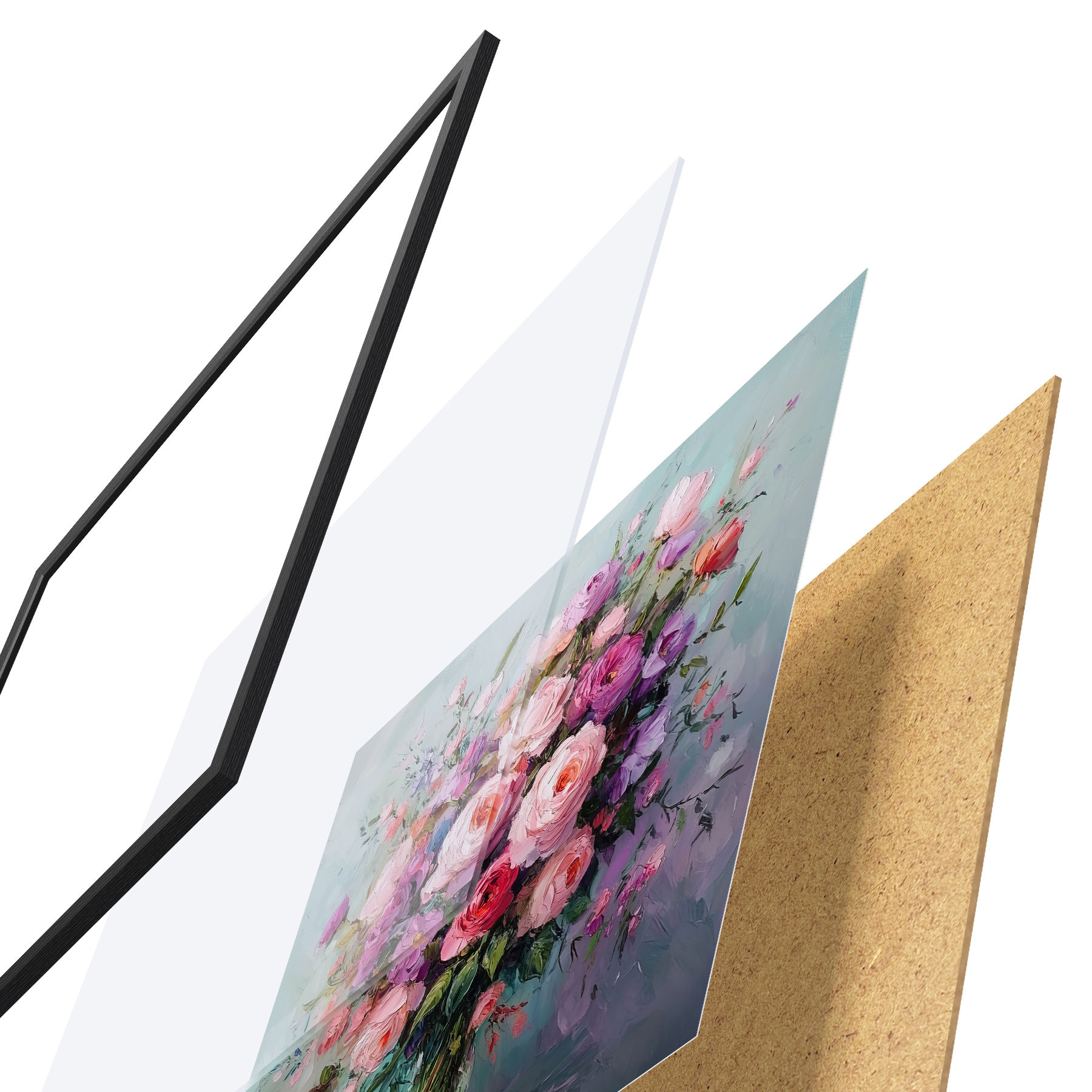 De poster bestaat uit een frame, plexiglas, geprinte afbeelding en spaanplaat achterkant. De poster kan meteen aan de muur worden gehangen dankzij de bevestigingen op de achterkant.