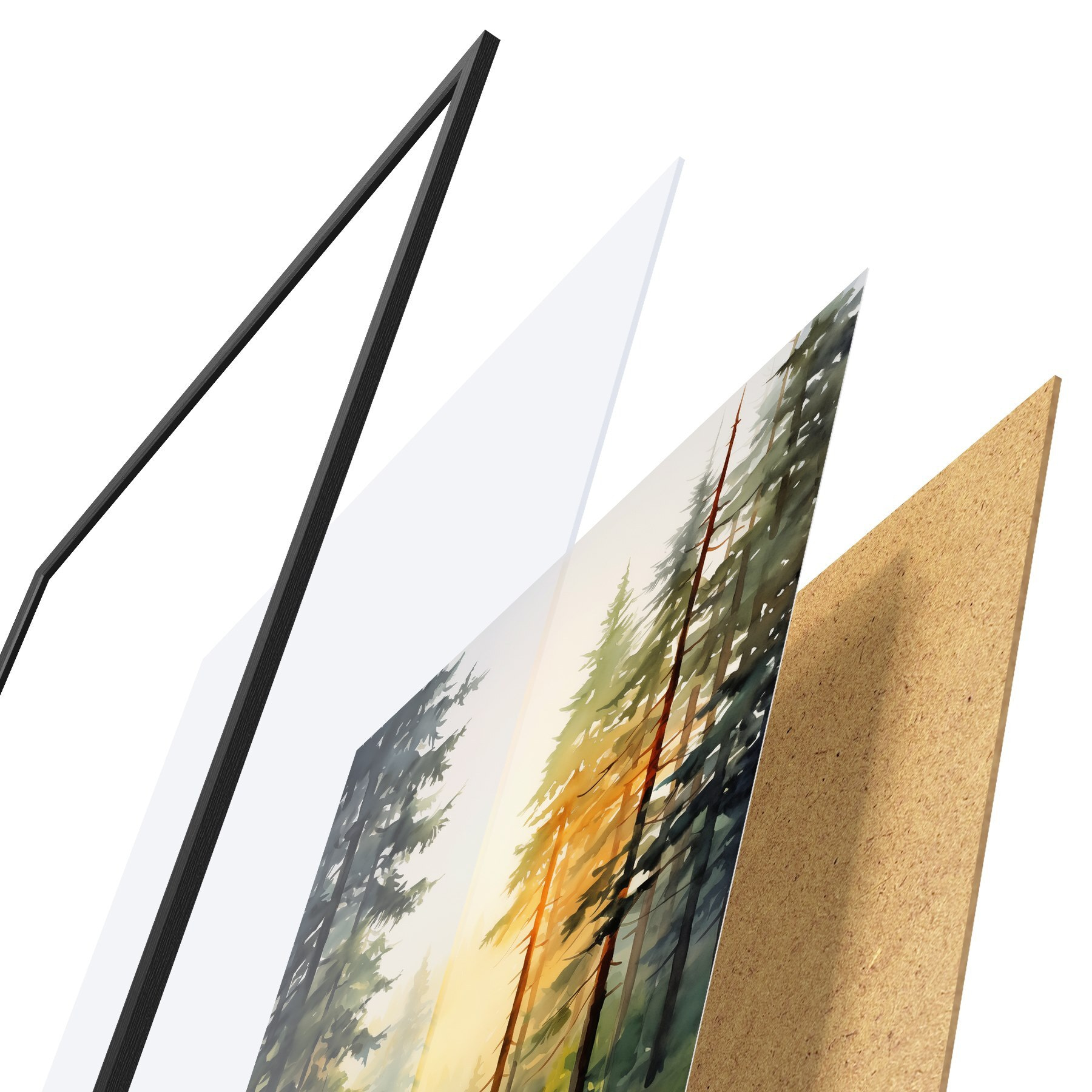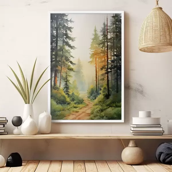 Poster Prachtig aquarelbos met pijnbomen en zacht zonlicht Nr f41637