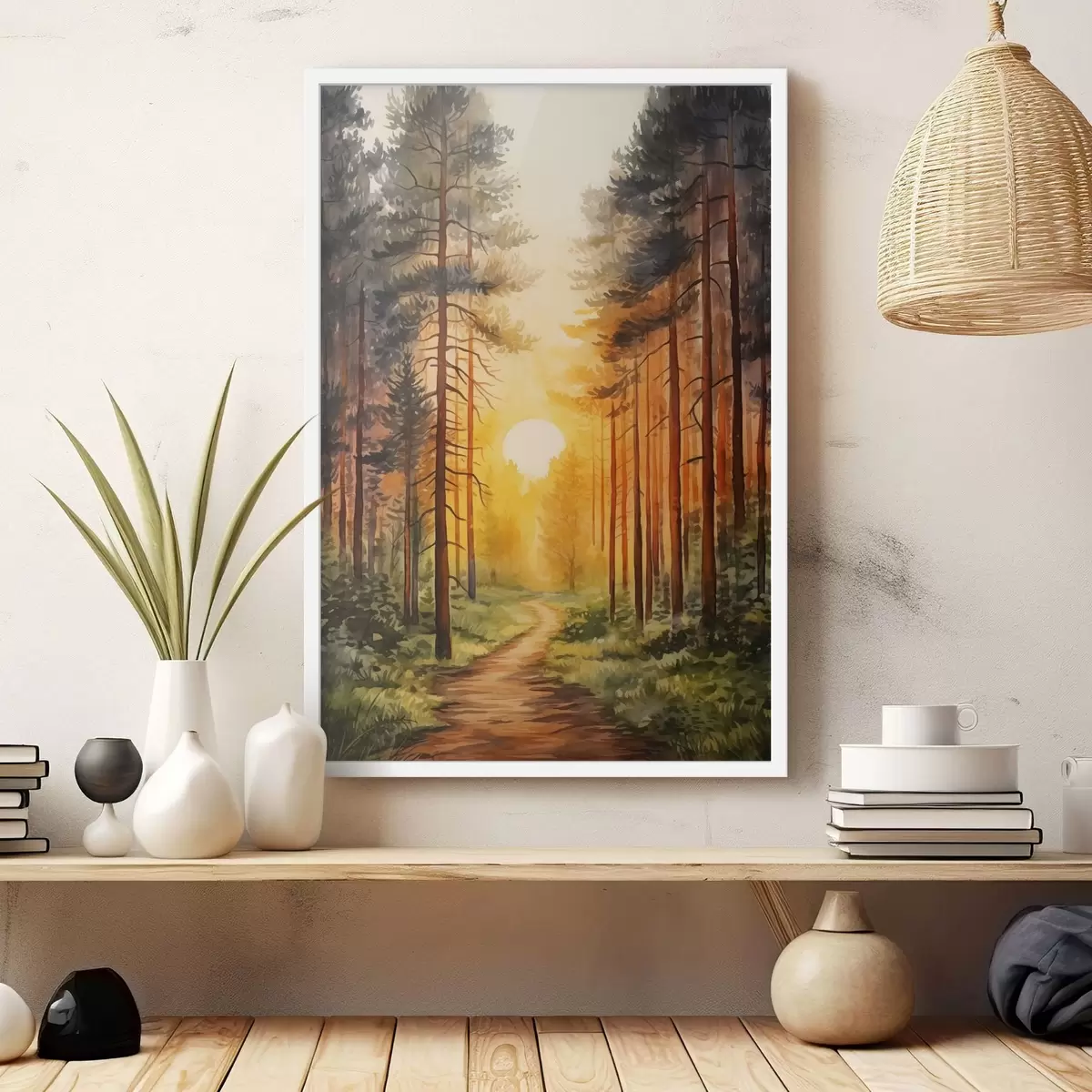 Poster Zonsondergang in het dennenbos, aquarel, natuurschoon Nr f41638