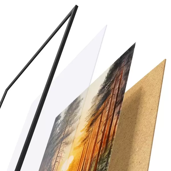 De poster bestaat uit een frame, plexiglas, geprinte afbeelding en spaanplaat achterkant. De poster kan meteen aan de muur worden gehangen dankzij de bevestigingen op de achterkant.