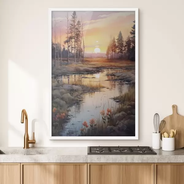 Poster Mooie rivier in het herfstbos, aquarel, weide, zonsondergang lucht f41643
