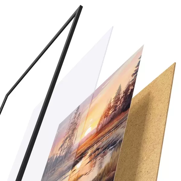 De poster bestaat uit een frame, plexiglas, geprinte afbeelding en spaanplaat achterkant. De poster kan meteen aan de muur worden gehangen dankzij de bevestigingen op de achterkant.